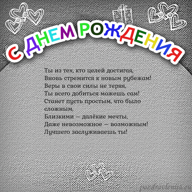 Прекрасно, когда для виновника торжества гости подбирают душевные и лично ему адресованные поздравления. В наш век технологий всё чаще близкие и друзья поздравления с днем рождения отправляют SMS-сообщением, по электронной почте или пожеланием в социальных сетях. Те бумажные открытки, которые еще совсем недавно мы отправляли по почте, все чаще заменяют открытки, высылаемые по почте электронной. Выбор открытки или поздравления ко дню рождения зависит от именинника, его возраста, увлечений, мечты.Для молодежи, детей, очень близких приятелей подходят смешные, юмористические поздравления, для более солидных, зрелых юбилеев поздравления подбираются более серьезные, с глубоким смыслом. В зависимости от случая может быть достаточно короткого поздравительного текста с искренним пожеланием, предназначенным для конкретного человека, иногда более подходящим бывает стихотворное поздравление. Поздравительные тексты, которые предназначаются для любимого человека, могут быть сексуальными, с эротическими намёками.Для поздравления детей подходят веселые четверостишия. Взрослые дети, поздравляя своих мам, чаще всего благодарят их за то, что мама их вырастила, заботилась о них, желают маме, чтобы та нашла время для отдыха и для себя. В основном, чем ближе человек, которого поздравляем, тем более личным бывает поздравление. В текстах поздравлений по случаю юбилеев часто упоминается количество прожитых именинником лет, делается акцент на достижениях юбиляра.Наверное, не зря существует поверье, что сказанные на дне рождения искренние, индивидуальные пожелания сбываются. Поэтому пожелание, предназначенное для коллеги, скорей всего не подойдет для поздравления мамы, отца или бабушки, а поздравляя друга или ребенка, мы скорей всего подберем совершенно другие слова, нежели для поздравления любимого.