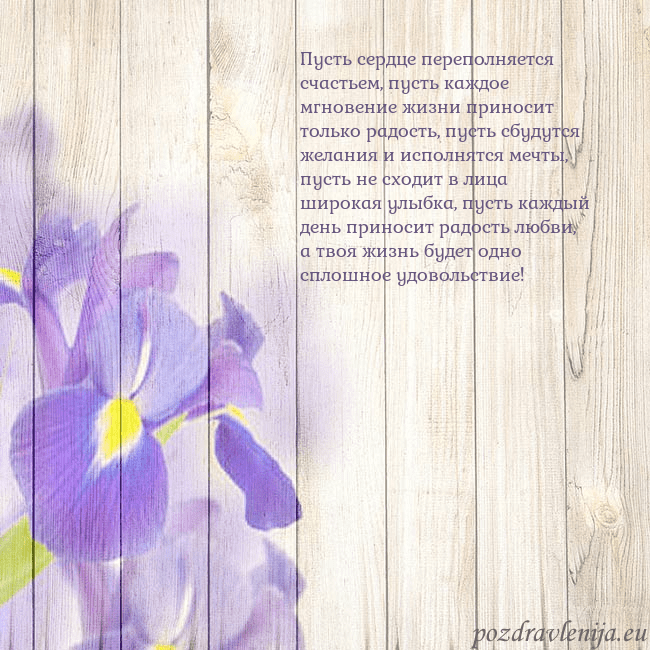Пусть сердце переполняется счастьем, пусть каждое мгновение жизни приносит только радость, пусть сбудутся желания и исполнятся мечты, пусть не сходит в лица широкая улыбка, пусть каждый день приносит радость любви, а твоя жизнь будет одно сплошное удовольствие!